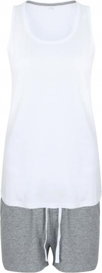 Denna högkvalitativa pyjamas-kit är perfekt för din komfort och stil! Den består av en vitt bakåt simmare bomull 100% topp, en grå melerad 85% bomull och 15% viskos shorts med elastisk midja och en grå melerad väska med snöre. Bjud in dig själv till en otrolig look och komfort med denna pyjamas-kit!