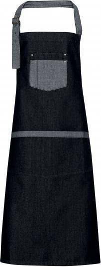 Denna industriella förkläde som är både elegant och praktiskt är tillverkat av 70% bomull och 30% polyester. Det har stora metallöglar i fästsystemet och baksidan med kontrast är synlig på fickorna och fästena, för en reversibel stil. En metallreglage på halsen för att justera längden på förklädet, och det har en central ficka på 36 cm i denim med kontrastfärgade detaljer, samt ett pennfack. Kontrasterande fästband (längd 100 cm) och fästsystem med metallöglar kompletterar detta förkläde som mäter 86 cm högt och 72 cm bredt.