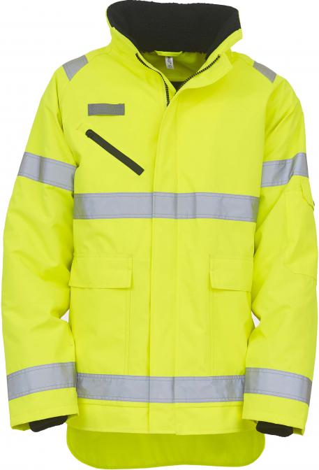 100% vattentät och andningsbar tåligt polyester med litet rutmönster. Avtagbart velourunderlag. Retroreflekterande band med dubbel nålfinish (5 cm bred) på kroppen och armarna och 2 reflekterande band på de övre axlarna. Sammetfodrad krage med integrerad avtagbar huva. Ultraresistent dragkedja med flik. Ytterfickor med dubbla sidor och sidoåtkomst, fleecefoder för extra värme. Pennficka och mobilficka på vänster arm. Bröstficka på höger sida med vattentät dragkedja och dold ID-ficka. Radioslinga på höger bröst. Justerbar bakpanel för optimal täckning. Optimalt utrymme för anpassning på framsidan och osynlig dragkedja på plaggets undersida (invändig sida). Överensstämmer med EN ISO 20471 kategori 3, EN342: 2004 skyddsnormer och UK Railway High Visibility Clothing Standard GO / RT 3279 utgåva 8: 2013 (endast Hi-Vis Orange).